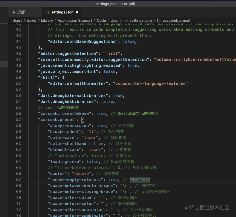 设置右上角中间图标打开设置(json),打开的对应文件是settings.json - 加入以下内容并重启