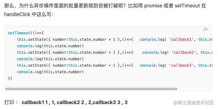 那么,为什么异步操作里面的批量更新规则会被打破呢?比如用 promise 或者 setTimeout 在 handleClick 中这么写: