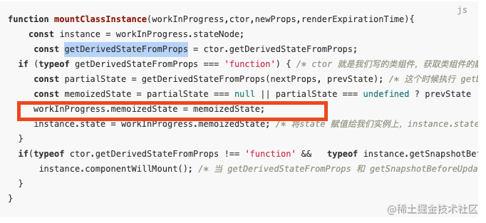 instance.state = workInProgress.memoizedState; /* 将state 赋值给我们实例上,instance.state 就是我们在组件中 this.state获取的state*/