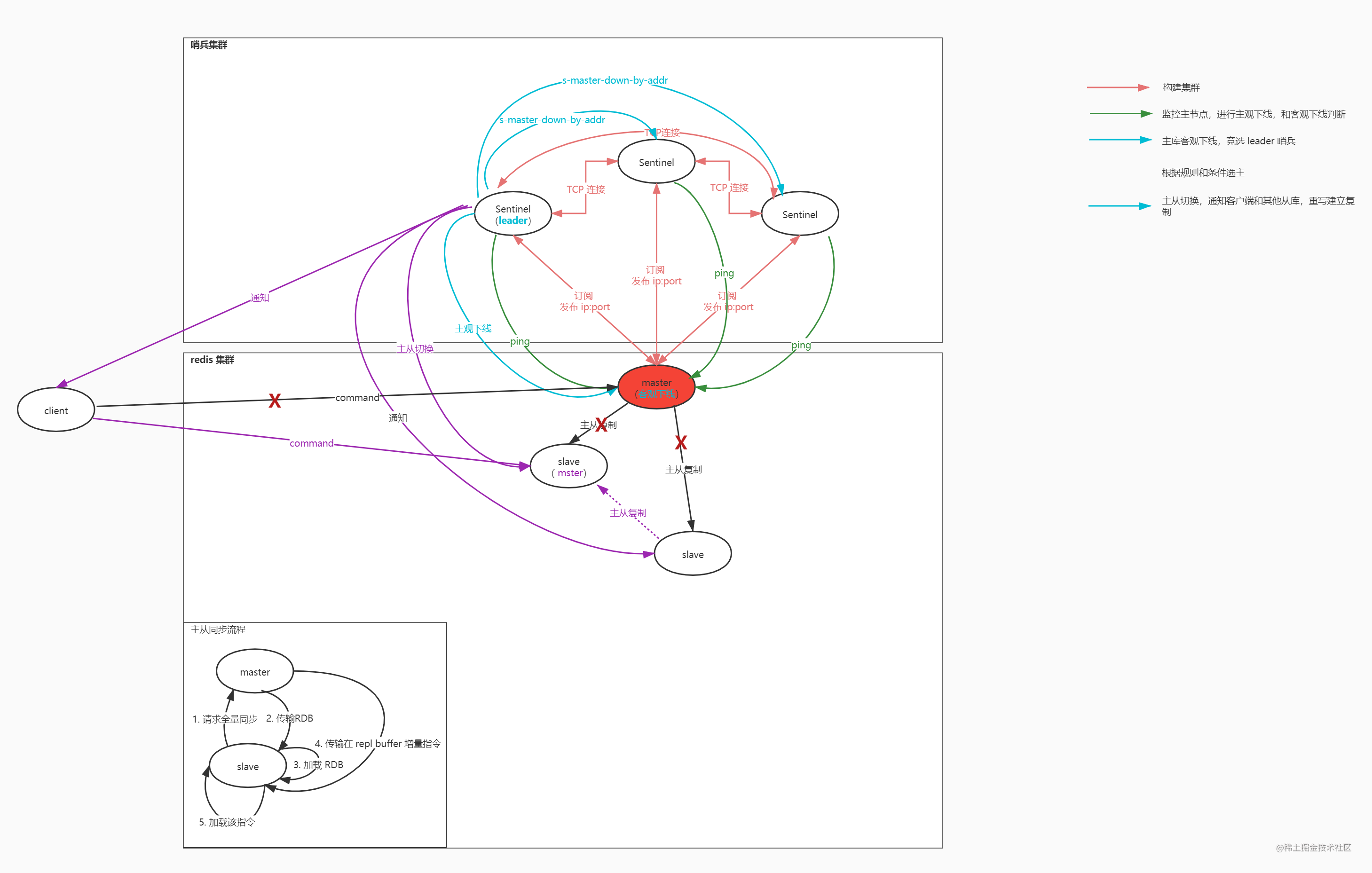 它负责持续监控主从节点的健康,当主节点挂掉时,自动选择一个最优的从节点切换为主节点。客户端来连接集群时,会首先连接 sentinel,通过 sentinel 来查询主节点的地址,然后再去连接主节点进行数据交互。当主节点发生故障时,客户端会重新向 sentinel 要地址,sentinel 会将最新的主节点地址告诉客户端。如此应用程序将无需重启即可自动完成节点切换。比如上图的主节点挂掉后,集群将可能自动调整为下图所示结构。