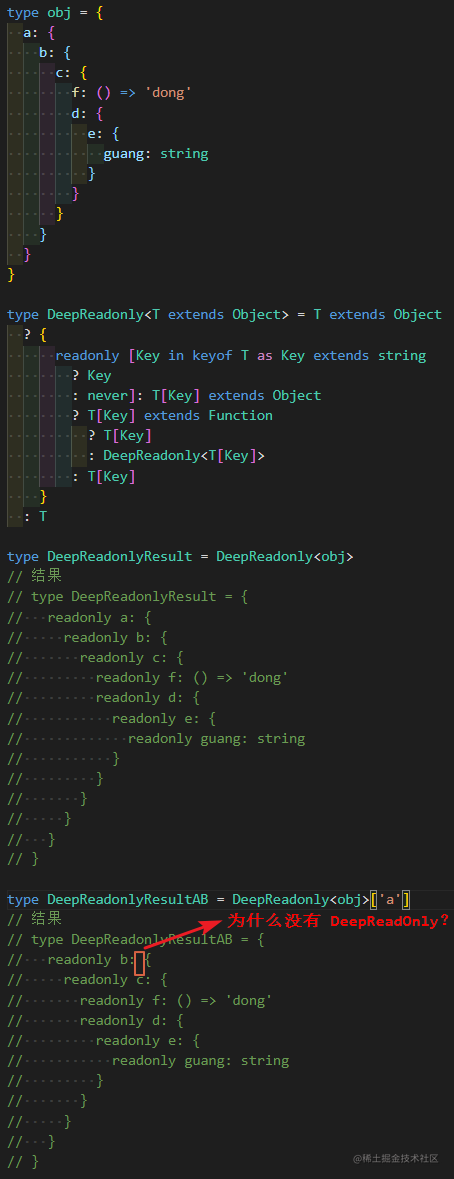如果是 object 类型但不是 Function,那就是说也是一个索引类型,就递归处理 DeepReadonly<Obj[Key]>。