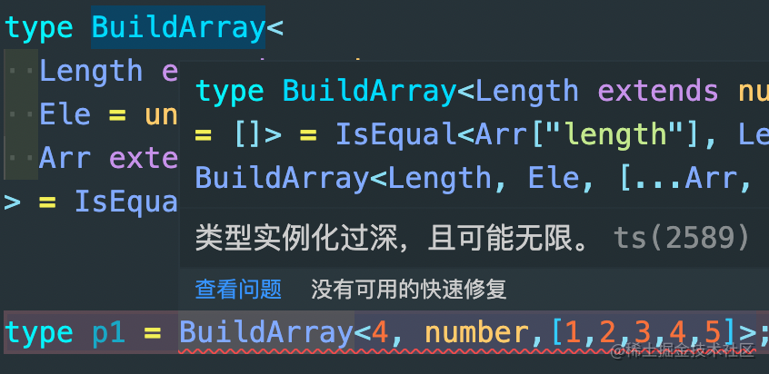 类型参数 Length 为数组长度,约束为 number。类型参数 Ele 为元素类型,默认值为 unknown。类型参数 Arr 为构造出的数组,默认值是 []。