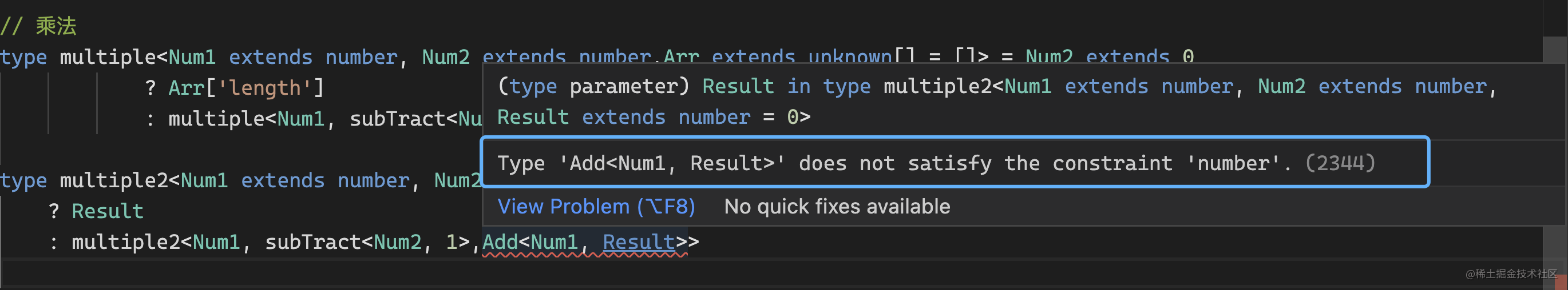 上面一句将Add类型通过never计算一次就能过。这个我估计跟上一章讲的,typescript类型在未被使用的时候不会计算,所以需要never强行计算一遍。