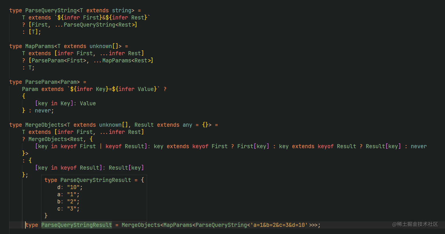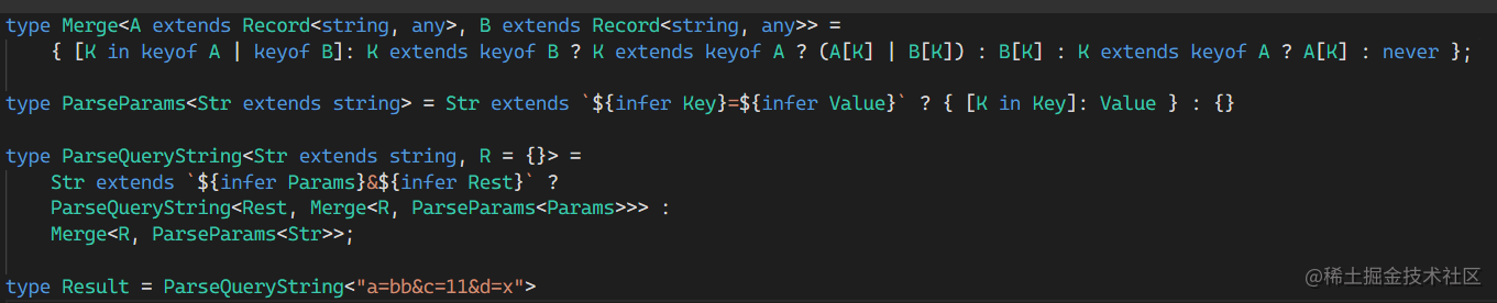 类型参数 Str 为待处理的 query 字符串,通过 extends 约束为 string 类型。