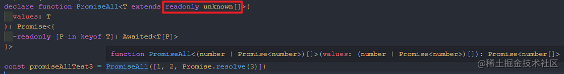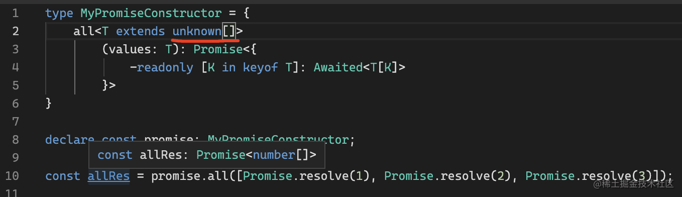 类型参数 T 是待处理的 Promise 数组,约束为 unknown[] 或者空数组 []。