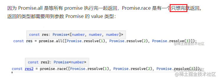 因为 Promise.all 是等所有 promise 执行完一起返回,Promise.race 是有一个执行完就返回。返回的类型都需要用到参数 Promise 的 value 类型: