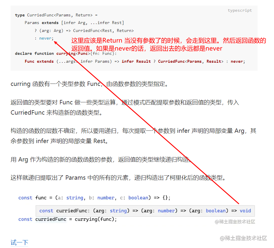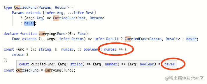 返回值的类型要对 Func 做一些类型运算,通过模式匹配提取参数和返回值的类型,传入 CurriedFunc 来构造新的函数类型。
